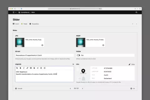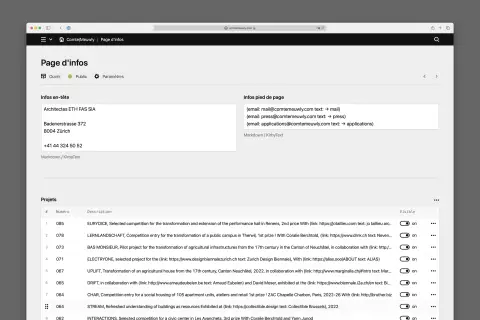 Un système de gestion de contenu clair prévu pour une utilisation extra-simple et autonome à l'interne par les architectes eux-mêmes.